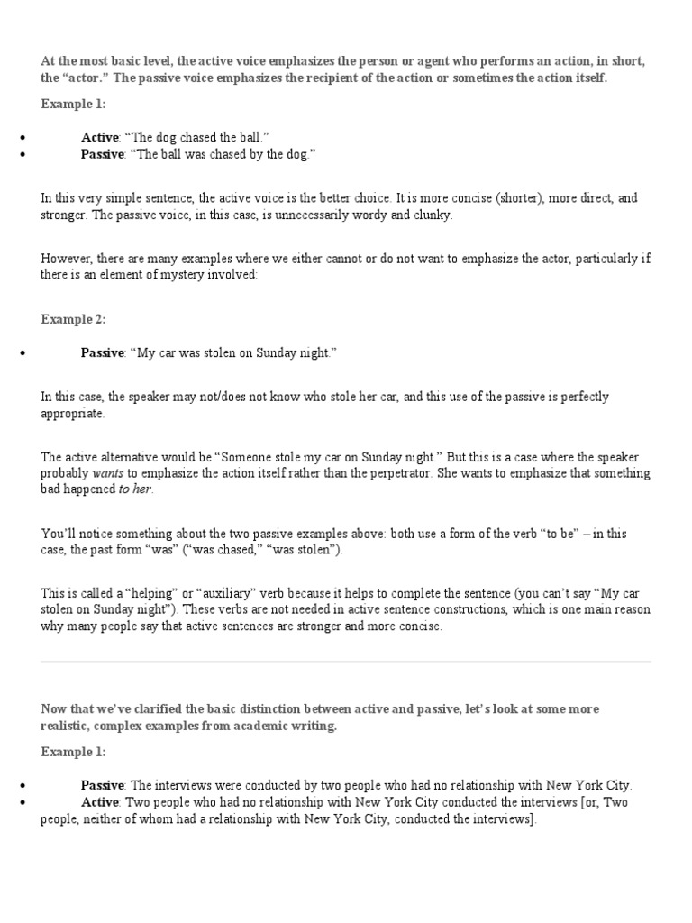 Though many style guides discourage the use of the passive voice, the construction can be quite effective, especially when the performer of an action is unknown or unimportant. Learn active voice vs passive voice rules, active & passive definition and examples with esl printable worksheets and useful video lessons. Sometimes what looks like passive voice isn't passive voice at all. Do you want to be the one doing the action or be passive? The focus is not on the person or thing that is responsible for the action.